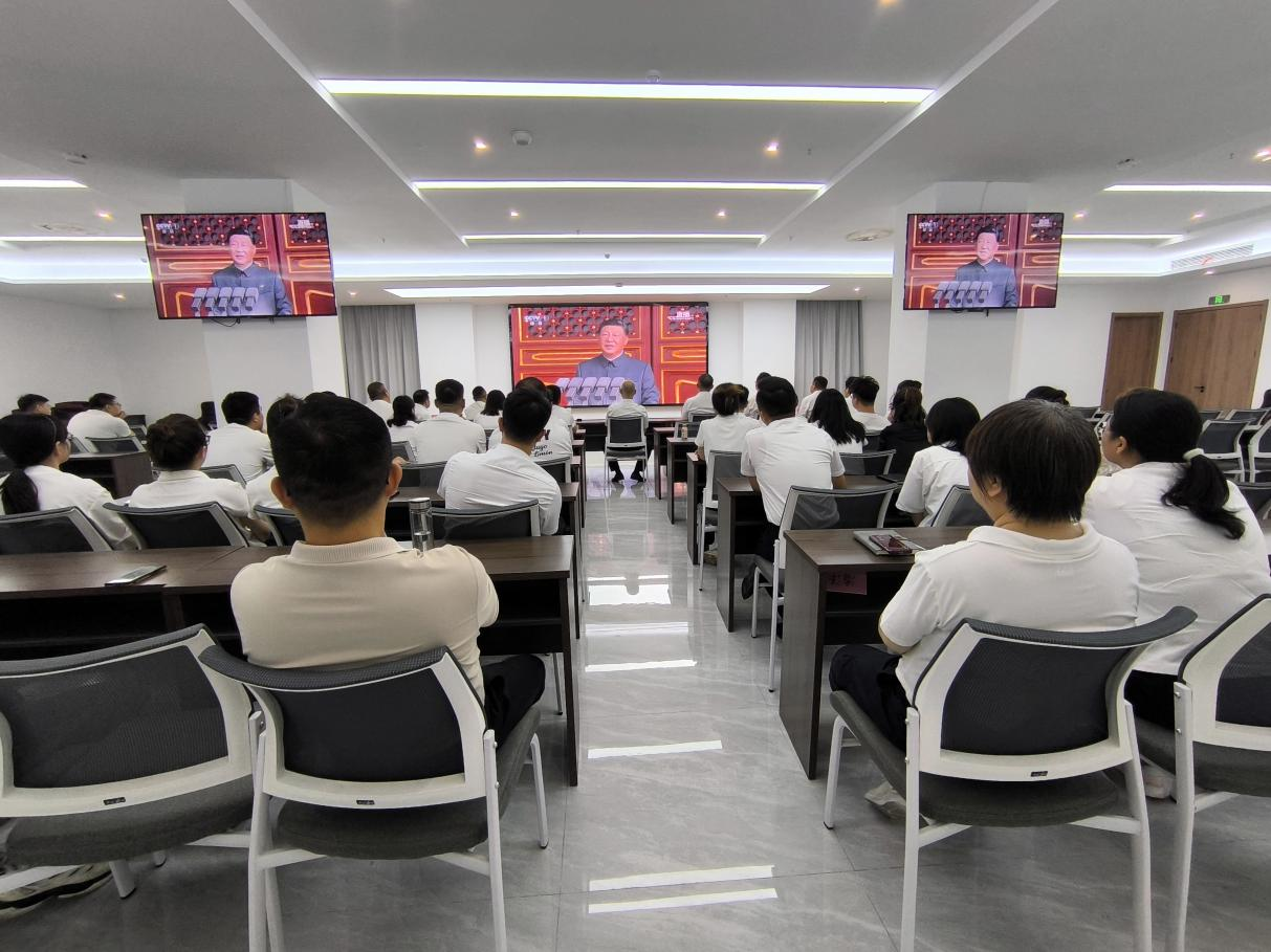 為銘記歷史、緬懷先烈,弘揚偉大愛國主義精神和抗戰精神,宿州投發組織全體干部職工集中觀看大會盛況。當一個個受閱隊伍邁著堅韌的步伐走過天安門廣場,一聲聲口號響徹云霄,身為中華兒女的民族自豪感和使命感在胸腔中澎湃。也讓我們更加深刻的懂得,今日山河無恙、家國安寧,其分量重若萬鈞。